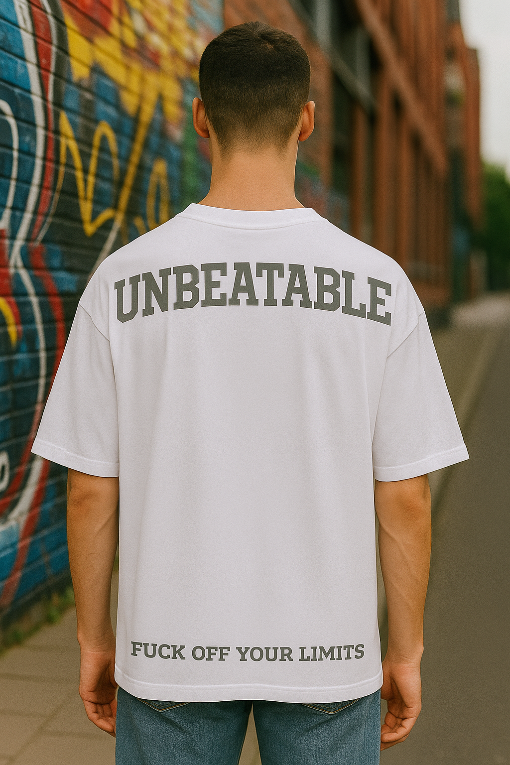 Camiseta de corte amplio en color blanco con gráfico trasero exclusivo: unbeatable «FUCK OFF YOUR LIMITS» logotipo VESTRAP en alta definición. Confeccionada en algodón premium, combina comodidad y estilo urbano para destacar en cualquier ocasión.
