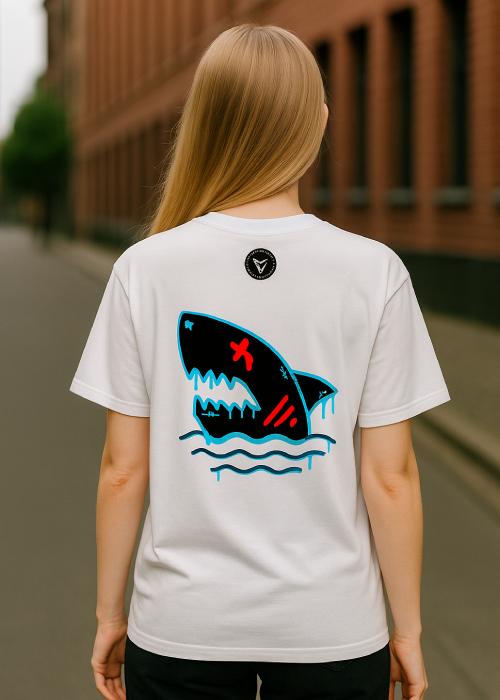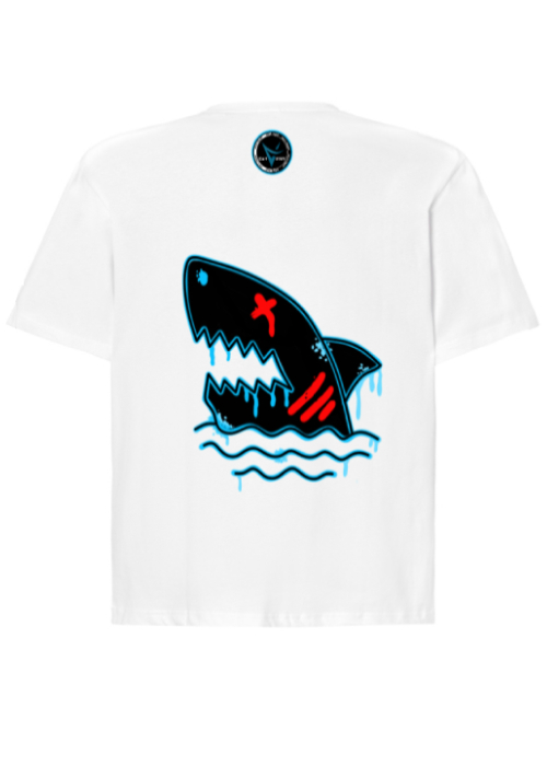 Camiseta de corte amplio en color blanco con gráfico trasero exclusivo: un diseño tiburón y logotipo VESTRAP en alta definición. Confeccionada en algodón premium, combina comodidad y estilo urbano para destacar en cualquier ocasión.