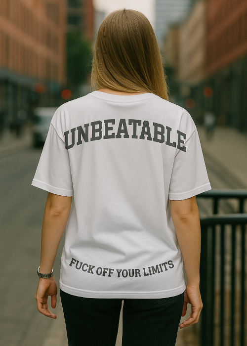Camiseta de corte amplio en color blanco con gráfico trasero exclusivo: unbeatable «FUCK OFF YOUR LIMITS» logotipo VESTRAP en alta definición. Confeccionada en algodón premium, combina comodidad y estilo urbano para destacar en cualquier ocasión.